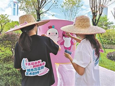 青年志愿者们在柱墩上绘出“喜洋洋”“乐融融”等全运元素彩绘。