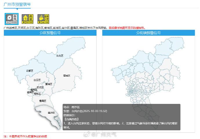 据@广州天气微博发布,截至3日15时53分,南沙、番禺、白云、荔湾、越秀、天河、海珠、黄埔、增城已发布台风白色预警信号。