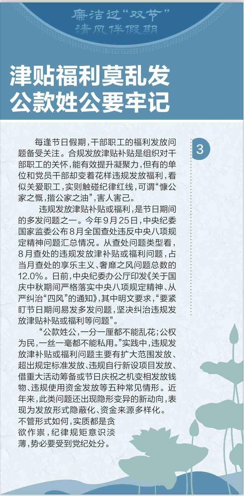 违规发放津贴补贴或福利,是节日期间的多发问题之一。今年9月25日,中央纪委国家监委公布8月全国查处违反中央八项规定精神问题汇总情况。从查处问题类型看, 8月查处的违规发放津补贴或福利问题,占当月查处的享乐主义、奢靡之风问题总数的12.0%。日前,中央纪委办公厅印发《关于国庆中秋期间严格落实中央八项规定精神、从严纠治“四风”的通知》,其中明文要求,“要紧盯节日期间易发多发问题,坚决纠治违规发放津贴补贴或福利等问题”。