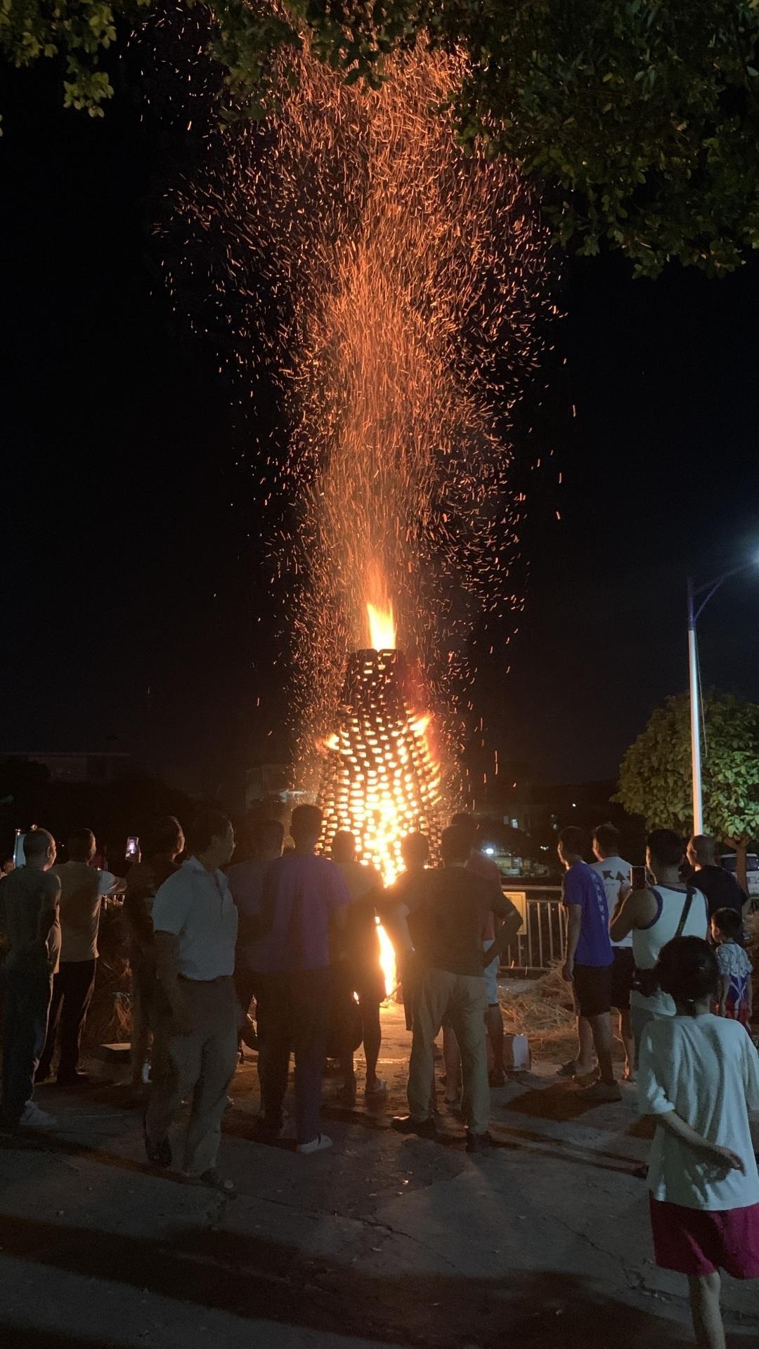 10月6日晚上7点,中秋满月悬于花都区炭步镇㘵溪村㘵头夜空,伴随着响亮的一声“点火!”三层半高的禾楼在村民倒计时声中轰然点燃,顿时火光冲天。围观的游客与村民发出阵阵欢呼,孩童们举着风车追逐飘散的火星,老人们则对着火光喃喃祈福。㘵溪村㘵头的率先点火,也拉开了炭步全镇中秋同庆“烧禾楼”的浪漫序幕。