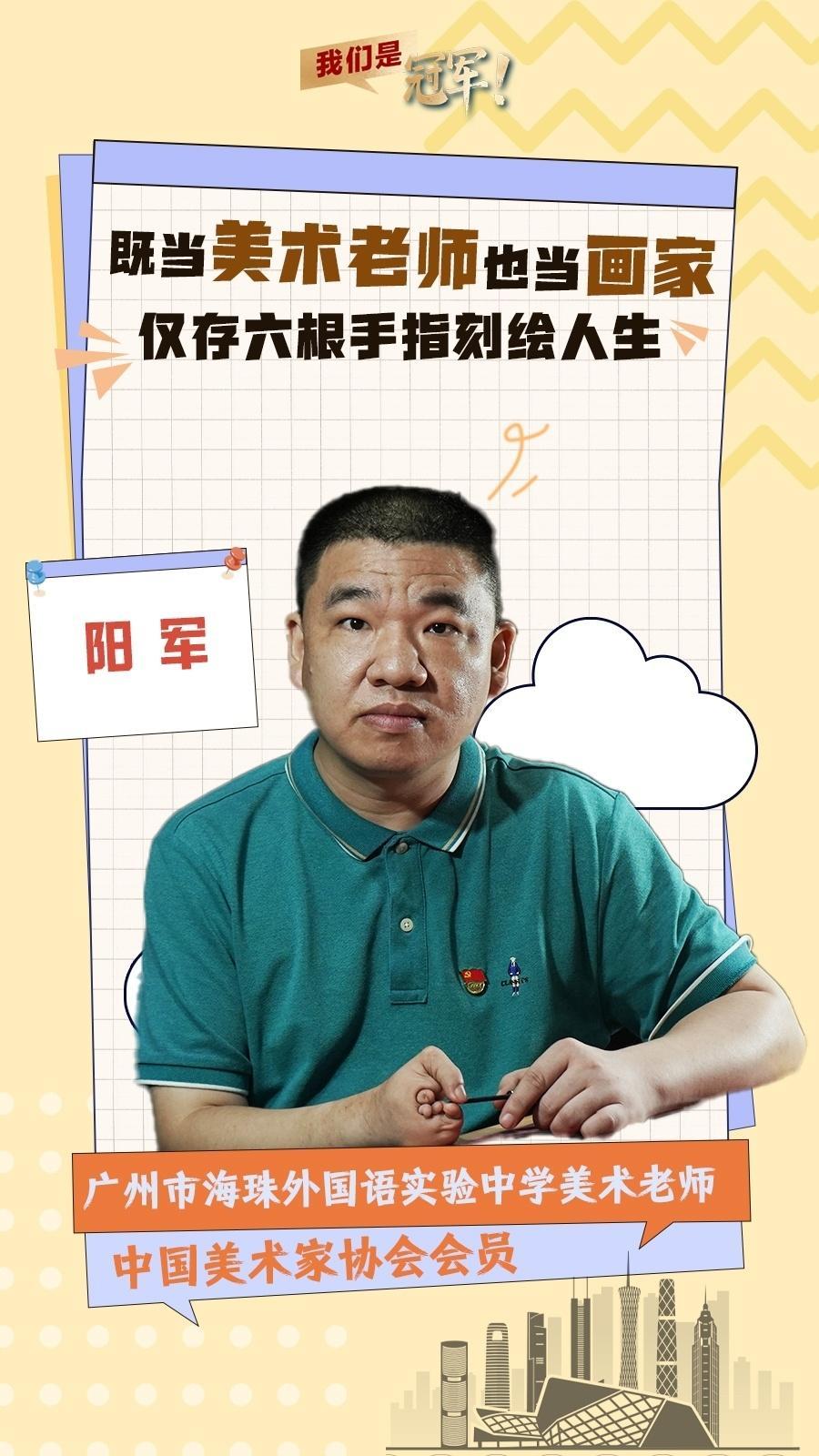 现为广州市海珠外国语实验中学美术老师的阳军,出生于湖南农村,右手先天残疾:四根手指全部萎缩,仅存一根缩小版的拇指。