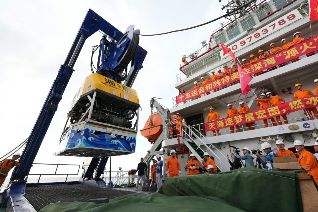 “海马”号深海遥控潜水器(ROV)入水瞬间。