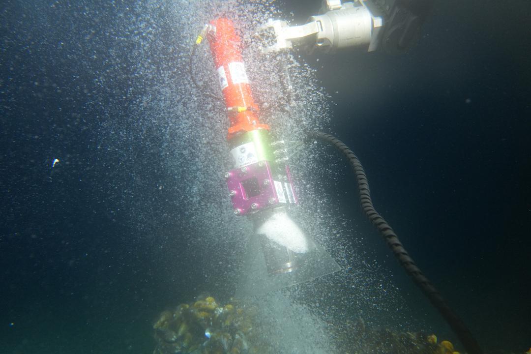 科研人员远程精准操控机械臂持采集舱,采集渗漏点溢出的可燃冰及伴生气。