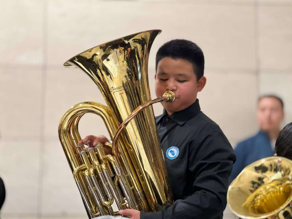 区智燊与音乐的缘分始于幼年,而与大号这位“笨重伙伴”的深度结缘,则是在他8岁就读于广州市白云区方圆实验小学二年级时。选择大号,对于当时个子还不算高的他而言,无疑是一个充满挑战的决定。然而,正是这份与众不同的热爱,让他坚持了下来。多年来,无论是校内的日常管乐团训练,还是校外的专业提升,他都未曾松懈。每日坚持练习,寒暑假积极参加管乐集训营,甚至远赴北京、上海、成都等地参与校际交流与大师课程,这一切都为他扎实的演奏功底和开阔的艺术视野奠定了坚实基础。