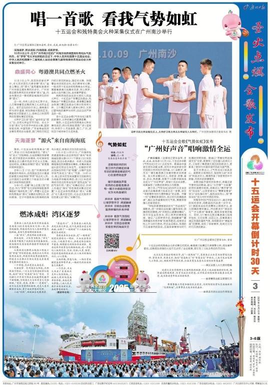 10月9日,十五运会和残特奥会火种采集仪式在广州举行。今日,广州日报隆重推出十五运会开幕倒计时30天特别报道,以“1+4+4”“城市+赛事”“科普+服务”的版面组合,发出湾区相约盛会的邀请和广州向海图强的强音,与读者共迎“广州好运”“湾区好运”“中国好运”。