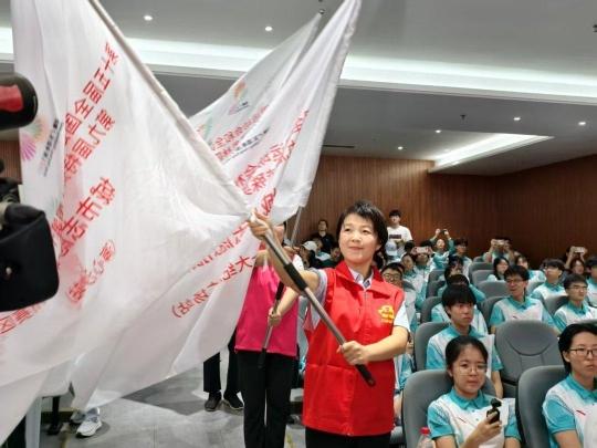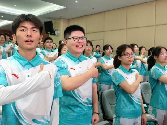 10月11日上午,近300名志愿者代表在广州市团校庄严集结,共同参与十五运会和残特奥会广州志愿者授旗仪式。十五运会和残特奥会开幕式志愿者代表和来自场馆站、交通枢纽站、社区站和共建站的城市志愿者代表依次登台,接过沉甸甸的旗帜,纷纷表示将恪守志愿精神,全力以赴完成接下来的服务任务。