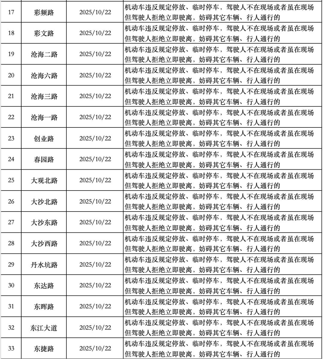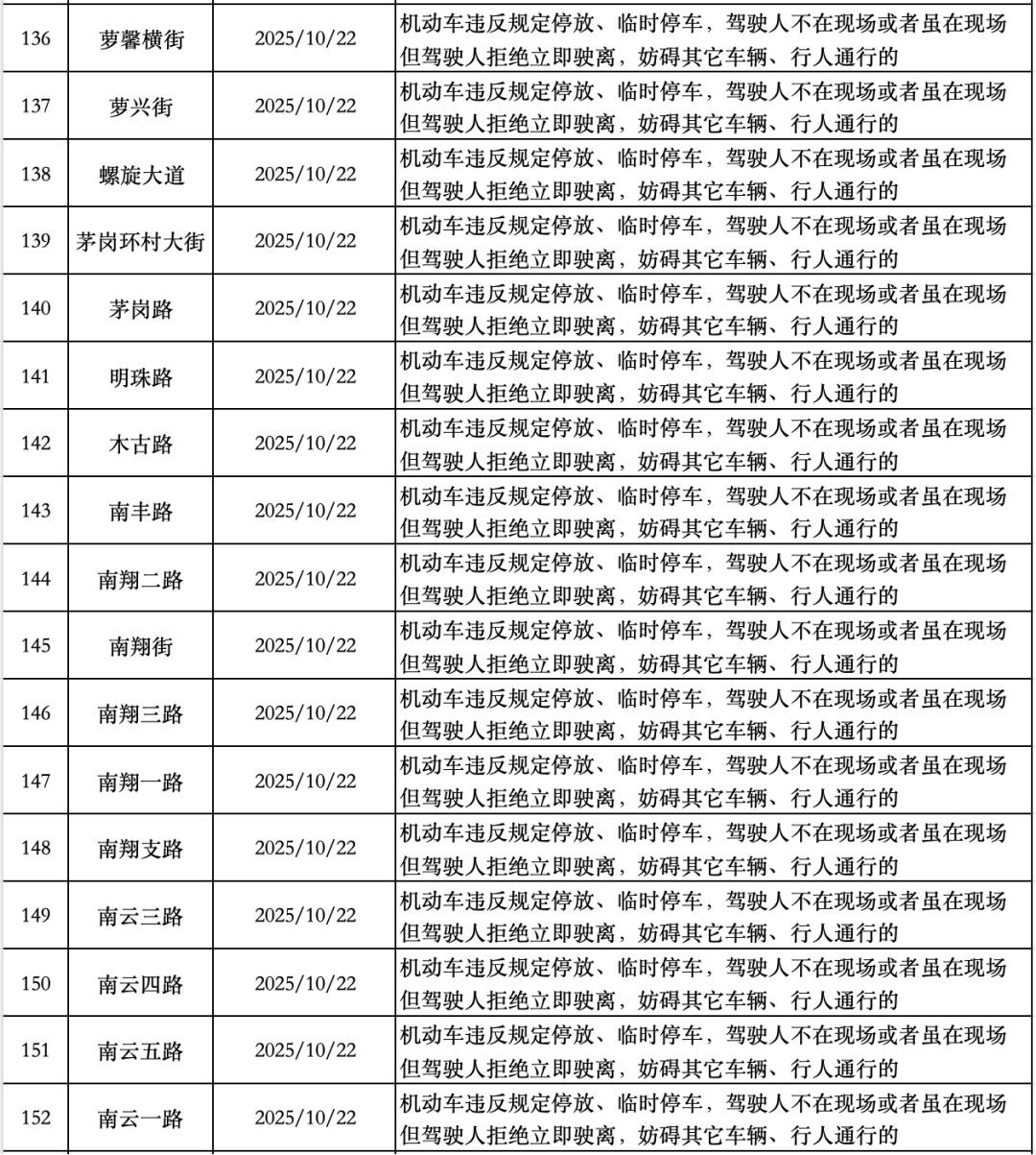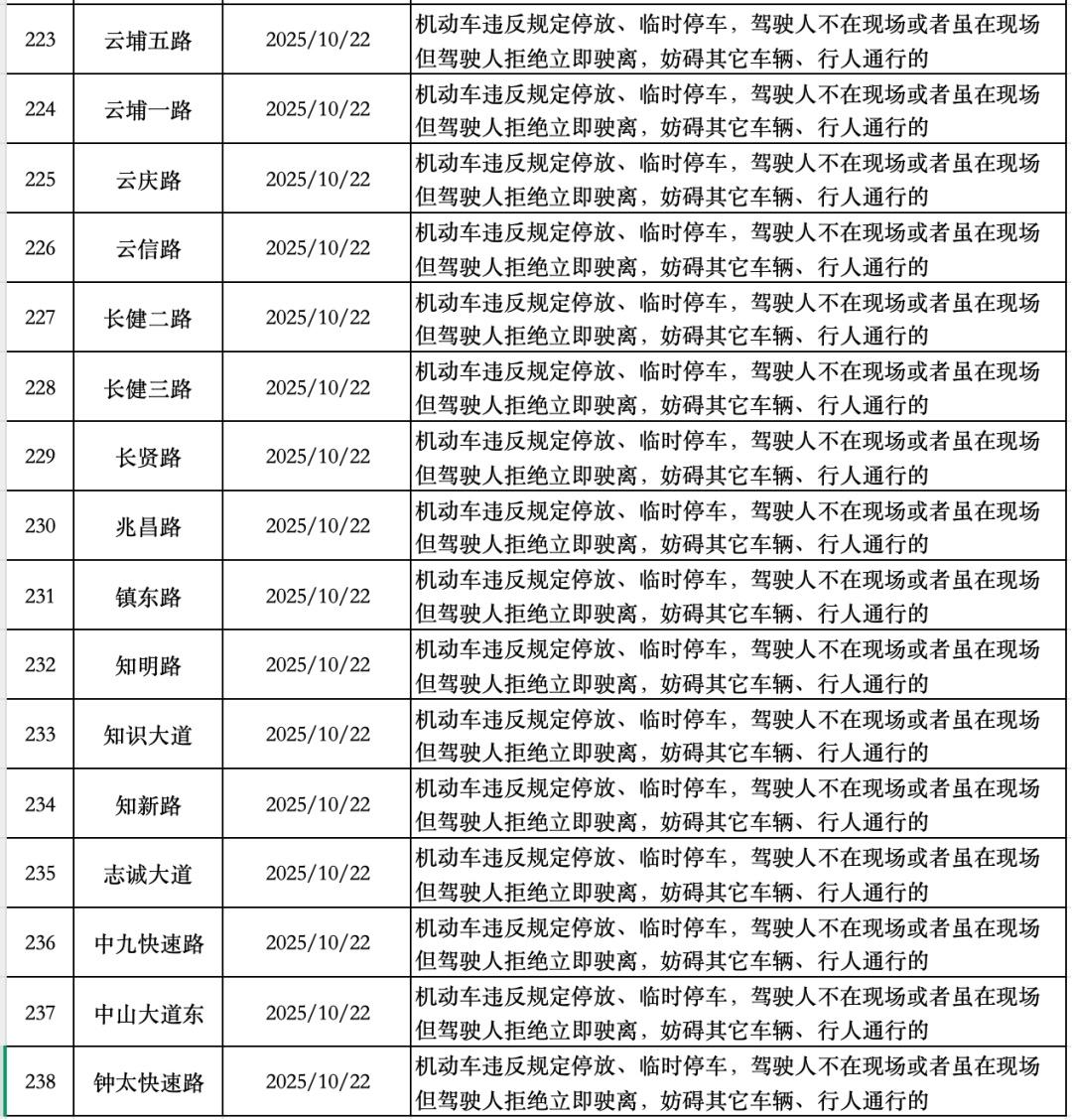 制式警车车载移动式交通技术监控设备执法类型涉及“机动车违反规定停放、临时停车,驾驶人不在现场或者虽在现场但驾驶人拒绝立即驶离,妨碍其它车辆、行人通行的”等,并将于2025年10月22日起依法对有交通违法行为的车辆进行拍摄取证执法。