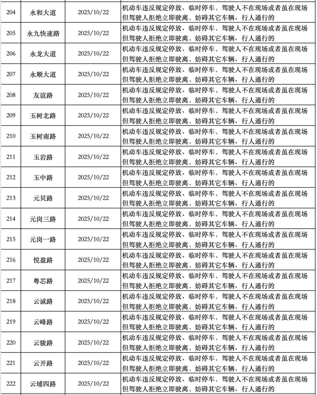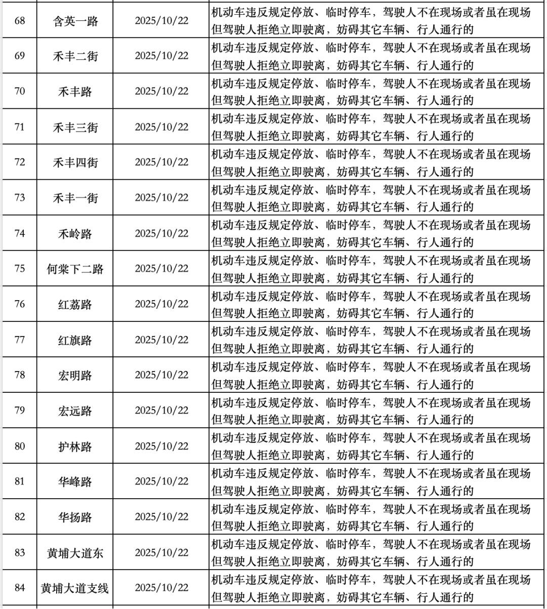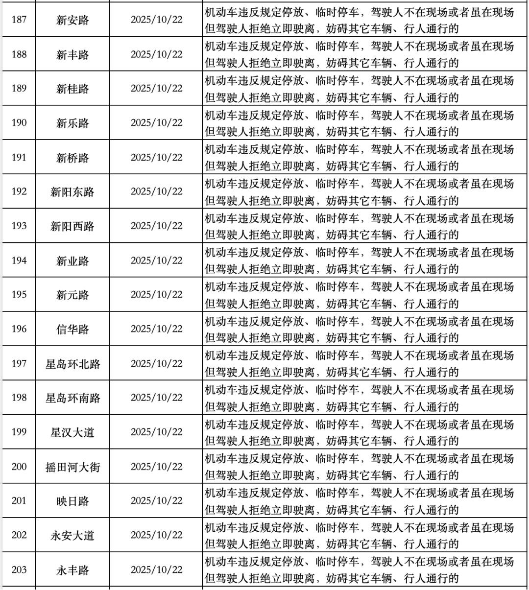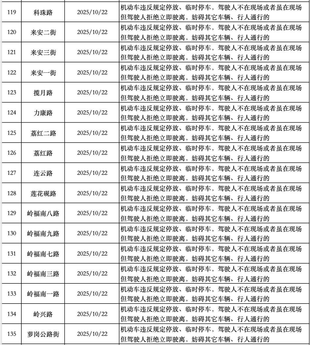 制式警车车载移动式交通技术监控设备执法类型涉及“机动车违反规定停放、临时停车,驾驶人不在现场或者虽在现场但驾驶人拒绝立即驶离,妨碍其它车辆、行人通行的”等,并将于2025年10月22日起依法对有交通违法行为的车辆进行拍摄取证执法。