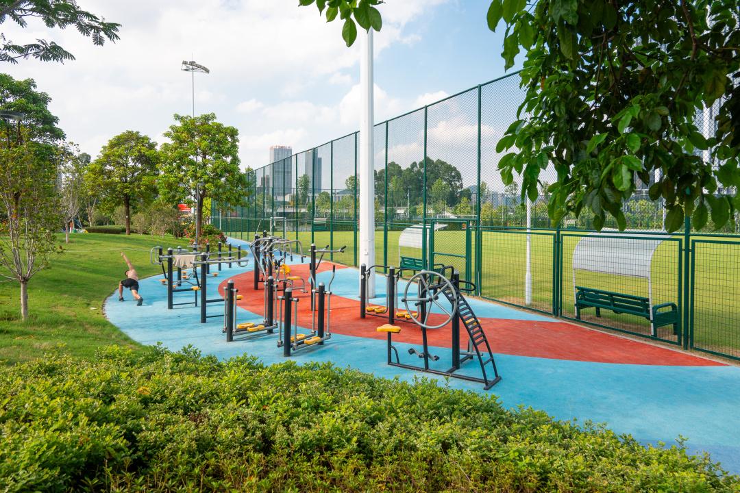 步入园区,满目苍翠令人心旷神怡。2.5万平方米的绿化景观,让这里成为名副其实的“城市绿肺”。公园充分体现“全龄友好”理念,园区设有11人制标准足球场、4个篮球场、2个网球场和5张乒乓球桌,满足不同运动爱好者的需求。还有专为儿童打造的色彩明快、设施丰富的游乐天地,包含攀岩墙、吊环、沙池等多种项目,既锻炼身体,又激发想象力。最引人注目的是,公园引入了多项智能设施,配备了太阳能充电功能的休闲座椅,市民可随时为电子设备充电;还有可实时计算卡路里消耗的智能健身器材,同步显示运动数据,让各年龄层市民在趣味体验中享受科技带来的运动革新,真正实现智慧运动、全龄共享。