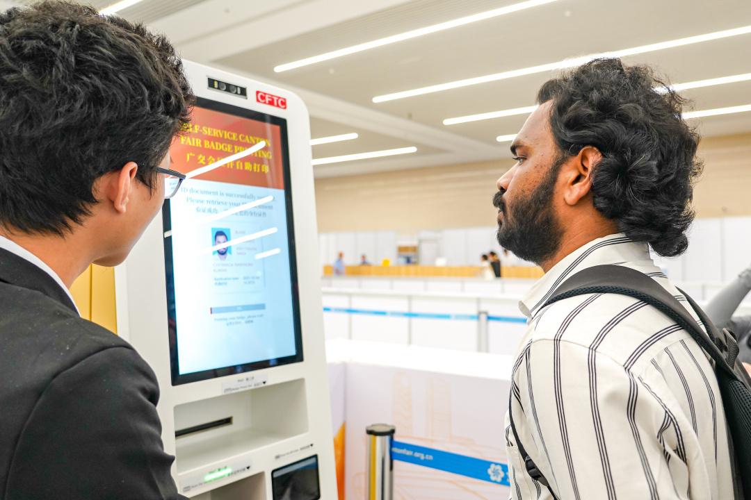 “我的朋友在手机上就能完成预登记,扫描一下30秒就能出证,很方便”,10月13日,马来西亚客商Kevin积极地指导朋友在自助机上办证。Kevin告诉记者,从2012年开始他就参加广交会,这次带来了尼日利亚的朋友一起来参加广交会,已然是一名“老前辈”。