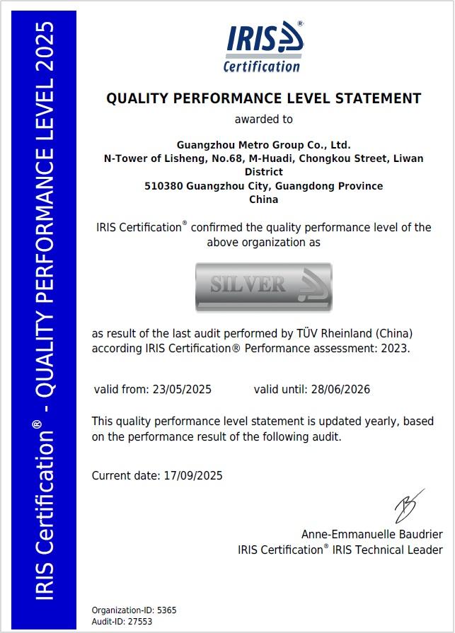 此次获得银牌认证,表明广州地铁在流程管理和服务体系等方面正持续与国际先进水平接轨,整体实力稳步提升。未来,广州地铁将以此次认证为契机,进一步推动管理创新与服务升级,持续提升运营质量与乘客体验,助力行业高质量发展。