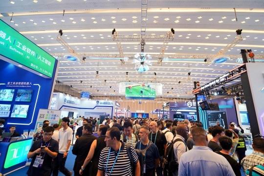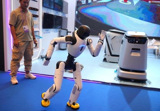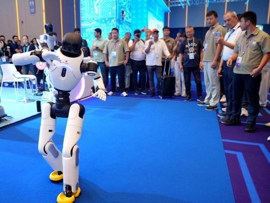 在服务机器人专区,来自广州企业视源股份的工业级四足机器人吸引了许多人的关注,它正轻松攀爬楼梯,即便踩在高低不平的石子路上,步伐也依旧稳健。