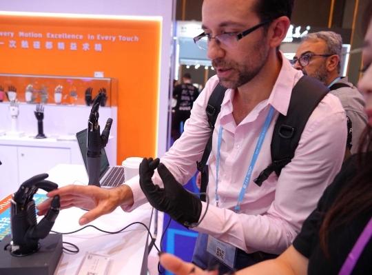 外商体验一家科技公司推出的“灵巧手”仿真训练。