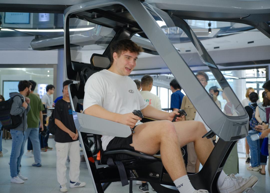 外国青年参观体验亿航智能的产品