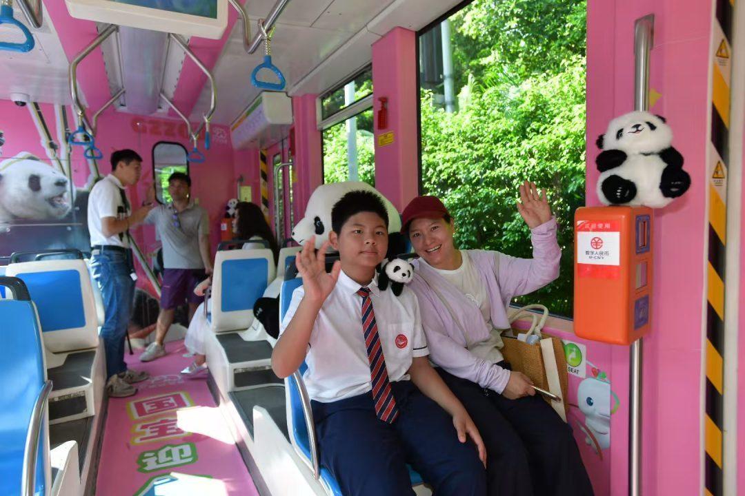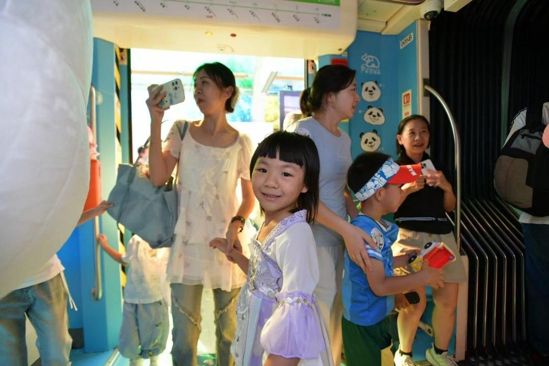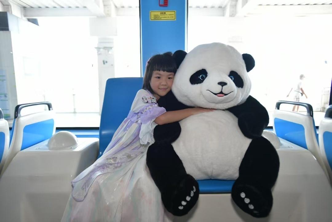 走进车厢内部,同样充满惊喜:四只大熊猫组团“出镜”,上车刷卡处摆放全运会吉祥物与熊猫玩偶,更有约1米高的熊猫打卡模型,营造出浓厚的“国宝迎全运”互动氛围。