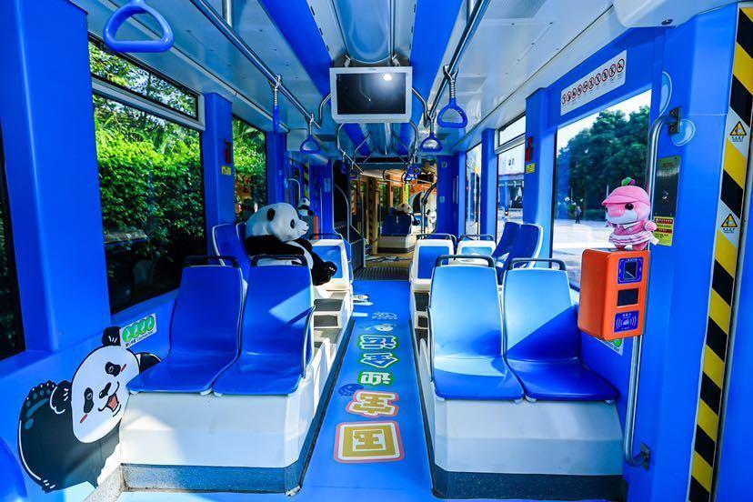 “广动号”主题有轨电车共四节车厢,采用黄、蓝、绿、粉等明快的“多巴胺”配色,将全运项目与熊猫特点巧妙融合,呈现广州动物园“星一”“雅一”和新成员“久久”“友友”4只大熊猫的独特个性。车厢外饰,不仅展示了每只大熊猫的“名场面”,更特别设计了它们与全运会吉祥物“喜洋洋”“乐融融”一同参与体育竞赛的趣味绘画,“雅一”自由体操、“星一”奔跑踢球、“久久”挑战举重、“友友”则化身游泳选手,将国宝的魅力与运动的快乐传递给每一位乘客。走进车厢内部,同样充满惊喜:四只大熊猫组团“出镜”,上车刷卡处摆放全运会吉祥物与熊猫玩偶,更有约1米高的熊猫打卡模型,营造出浓厚的“国宝迎全运”互动氛围。