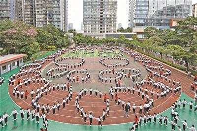 天河区盈彩美居小学校长匡昱介绍,学校打造了三套大课间方案,其中,武术大课间融入了武术操、南拳等,让学生在一招一式中传承中华传统文化;体能大课间、室内大课间融入了粤韵操,在雨天开展,确保运动不中断。