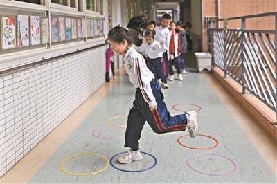 匡昱介绍,学校在课时统筹方面大胆创新,在综合实践活动中融入体育与健康跨学科主题活动,探索英语与体育相结合的游戏。学校利用大课间、微课间、课后服务等时段,将2小时拆解为“1节体育课+40分钟大课间+多个15分钟微课间+课后服务体育课程”,形成完整的时间链。在场地保障方面,该校盘活校园空间,把走廊、一楼中庭、操场等区域充分利用起来,划分班级活动区域,同时考虑功能分区化、流线合理化、设施人性化。人员保障方面,该校要求正副班主任“一班双岗”、体育教师“全域网格”负责指导,为学生运动提供指导和安全保障。