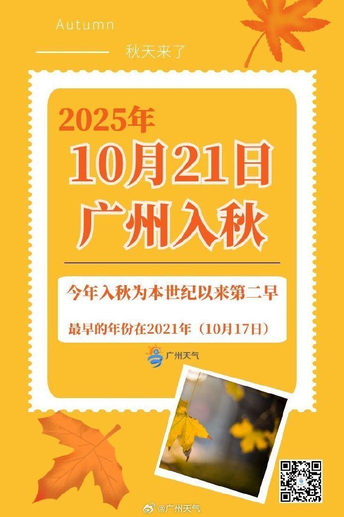 据@广州天气:截至10月27日20时,广州国家基本站连续5天的5日滑动平均低于22℃,而对应的日平均气温序列中第一个低于22℃的10月21日就是今年的入秋日啦!