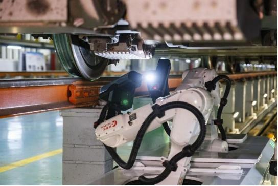 目前,广州动车段共配备了7台动车组检修机器人,全面推行“人机交检”作业模式。其中广州南动车所配置了4台车底检测机器人,机器人检查项点高达1.8万余项,搭载3D图像识别技术,率先在全路采用彩色4K相机,有效提升了对齿轮箱油污、水迹等问题的识别精准度,也为人工复核故障提供了清晰依据。“车底检修机器人的应用既保证了检查质量,也提高了作业效率。”操作人员高尚胤雄说道。
