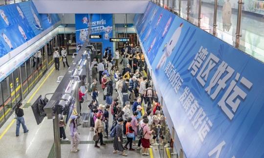 “远远看这些海报,色调很舒服,一开始还以为是纯文字设计,走近才发现每张都藏着巧思——比如‘区’字下面画着龙舟,还有一张海报上出现了一位‘95后’外贸博主……透过这些画面,我看到了大湾区形形色色的奋斗者。今天现场氛围特别热闹,吉祥物合影区也围满了人,整个站厅都活力满满。”市民思涵女士分享道。