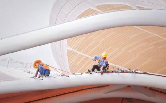 南立面幕墙施工技术也是全国首创。面对单根预拉力高达100吨的4300米拉索体系,团队研制精密张拉方案,并创新植入18根内置传感器的“智慧索”,实现幕墙体系全生命周期健康监测。