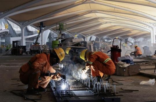 在焊接全国最大体量不锈钢屋面时,项目投入600名持证焊工,开发焊缝管理程序,对35万道焊缝实行“基层处理100%停检、成品100%举牌验收、数据100%建档”的精准管控,并引入连续自动焊机完成31.19万平方米屋面的无缝焊接。