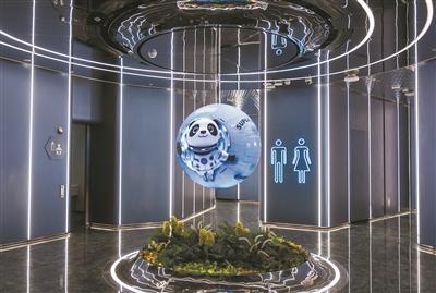 T3航站楼出发大厅的西旗舰洗手间,门口悬挂着一个球状显示屏,显示屏的图案一会儿是许多架飞机穿梭在地球各地,一会儿是个熊猫宇航员向你打招呼,球状显示屏上方还有镜面反射,非常有科技感。洗手间内部装修也颇具特色,门的颜色是蓝色橙色渐变的,配色时尚新潮,洗手台上方的镜子在灯光加持下也显得炫酷。