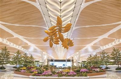 整个航站楼内的设计以暖色调为主基调,一改常规的工业风冷色调。如果从空中俯瞰,整个航站楼白色金属屋面也像花瓣,金属屋面的面积大约31.19万平方米,相当于45个标准足球场的大小。
