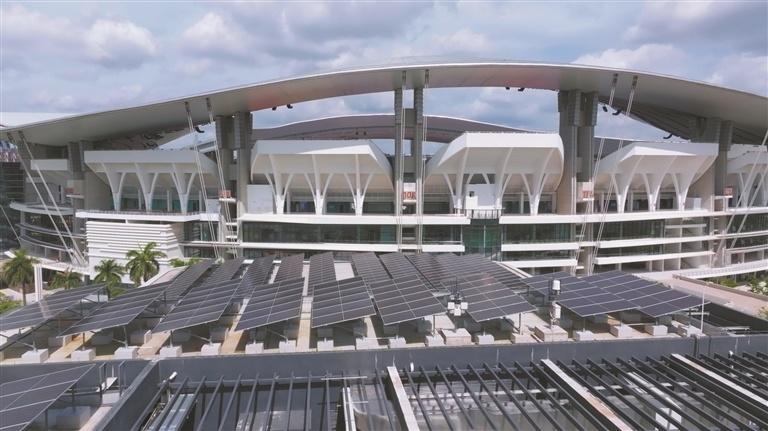 广东省奥体中心及周边的建筑均安装上了光伏板进行绿色发电。