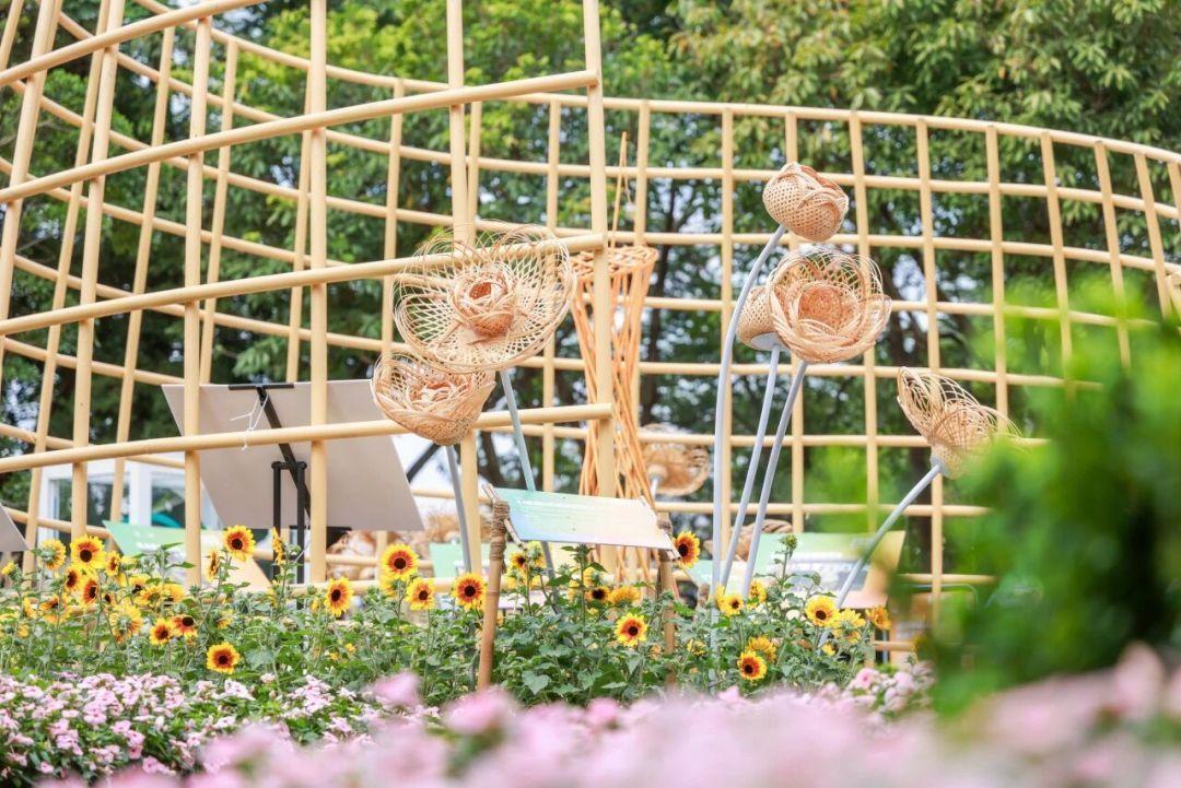 园内,传统工艺与现代设计相映成趣。竹编螺旋构架成为视觉焦点,融合技艺传承与结构创新;层次丰富的岭南花境,精选红花檵木、黄金榕等本土植物,勾勒出四季流转的生态画卷;模块化可拆装设计,贯彻绿色可持续理念,实现展后回迁与循环利用。整座展园不仅呈现艺术美感,更成为生态智慧与工匠精神的生动课堂。