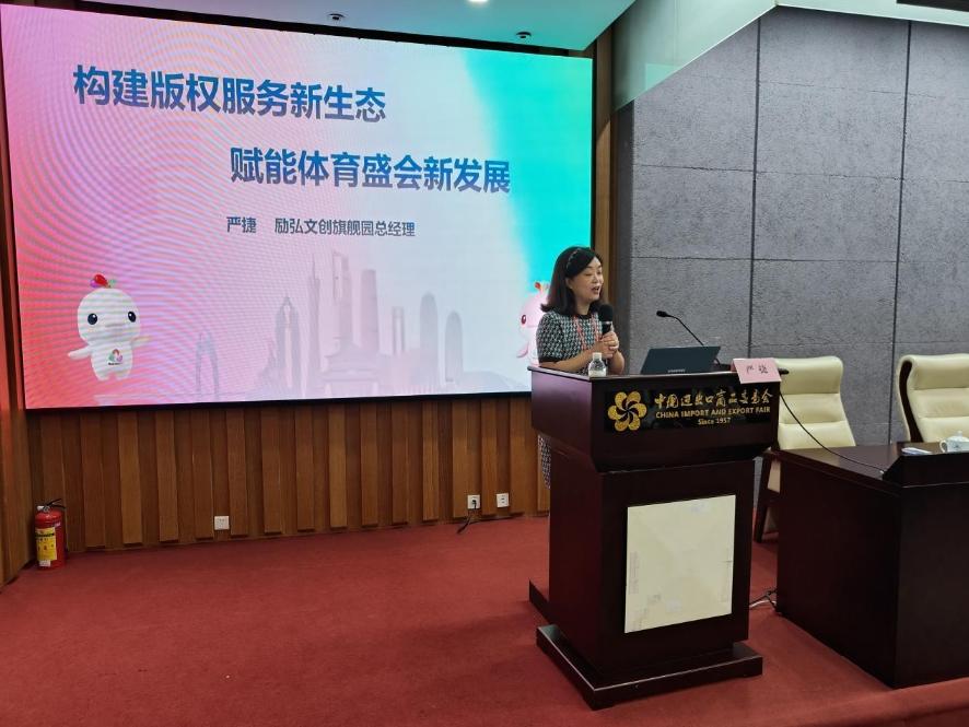 活动现场邀请了广州市版权局版权专家库专家、广东省版权兴业示范基地励弘文创旗舰园总经理严捷,分享其在“构建版权服务生态,赋能十五运与产业创新”方面的经验。据了解,近年来园区打造了版权“保护—交易—创新—金融—宣传”五位一体服务生态,通过“版权公证链”与调解室强化保护,依托华南版权服务大厅提供交易服务,承担国家级课题探索创新路径,设科技金融工作站破解融资难题。在十五运会筹备中,园区企业积极参与,通过制作“AI游广州”、创作榄雕工艺精品装点赛事空间、举办“IP欢乐跑嘉年华”实现“设计+体育+公益”融合,以全链条服务助力广州版权事业与体育盛会发展。