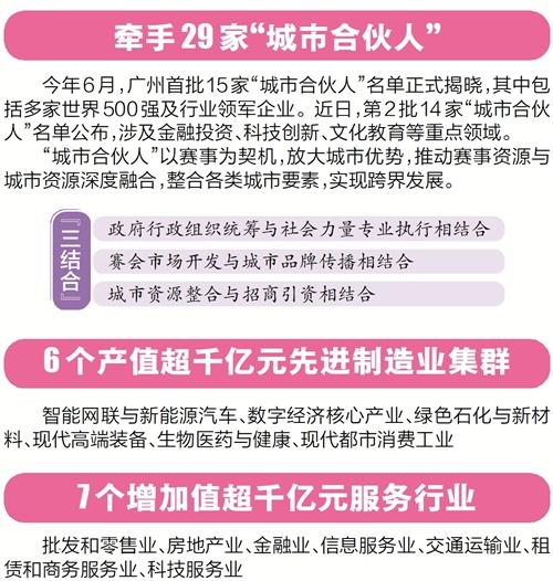 今年2月,广州面向全球启动“城市合伙人”征集计划,旨在以赛事为契机,放大城市优势,推动赛事资源与城市资源深度融合,整合各类城市要素,赋能“城市合伙人”实现跨界发展。该机制围绕城市品牌建设与产业发展关键环节,实现“三结合”——政府行政组织统筹与社会力量专业执行相结合、赛会市场开发与城市品牌传播相结合、城市资源整合与招商引资相结合。