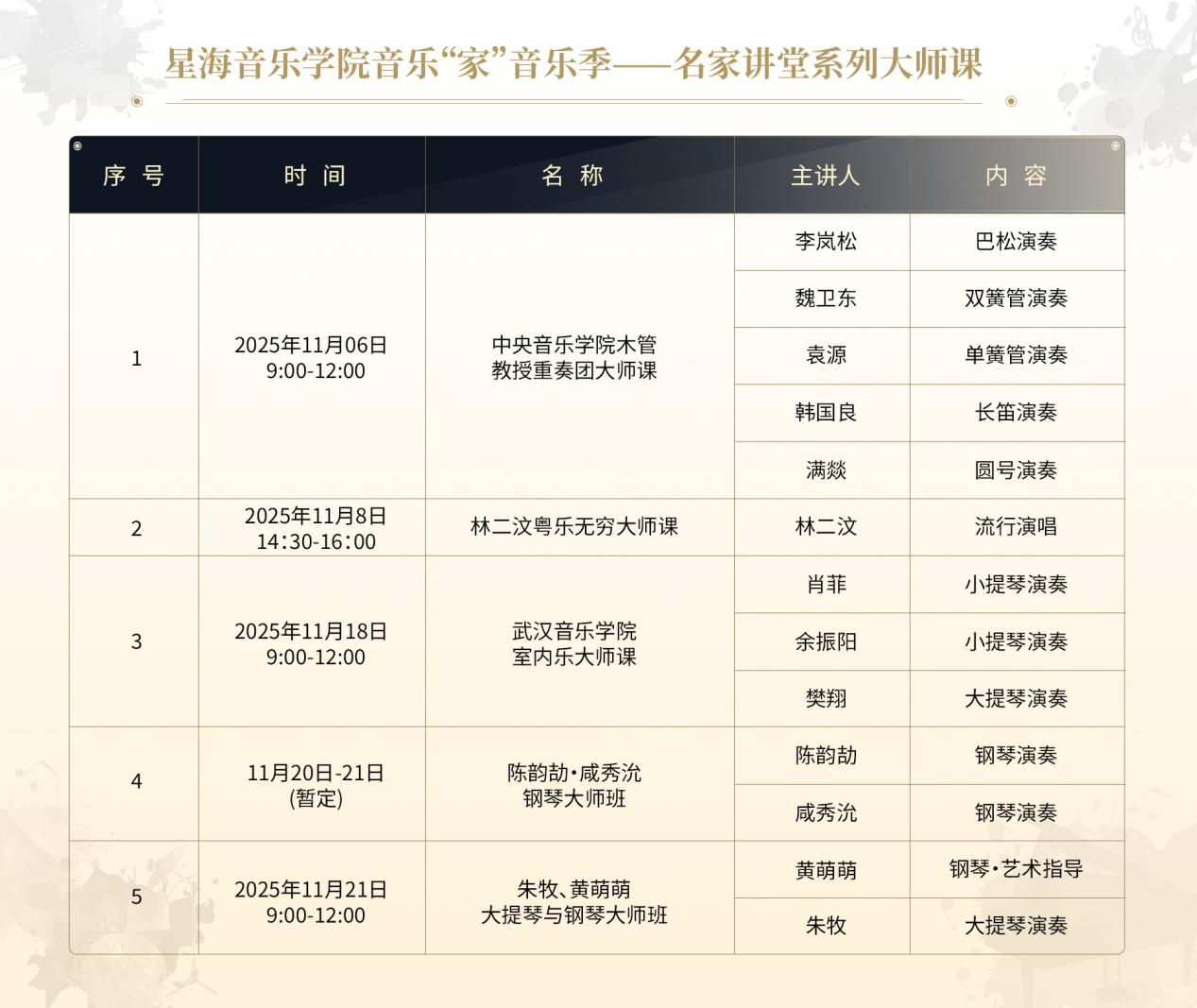 11月6日上午,首场大师课将由中央音乐学院木管教授重奏团开启。11月8日,著名音乐人林二汶将在郎朗音乐厅举办“粤乐无穷大师课”。后续还将推出武汉音乐学院室内乐大师课、钢琴家陈韵劼与咸秀沇的钢琴专业课程等。
