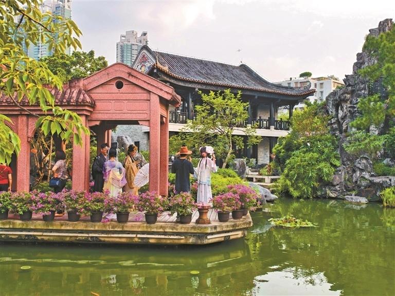广州以“绣花功夫”推动历史文化街区更新,图为年轻人身穿汉服在广州粤剧艺术博物馆内拍摄打卡。