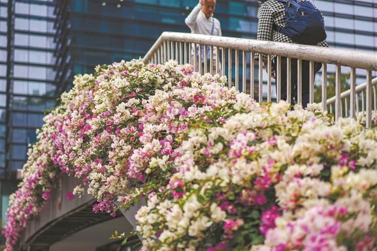 广州四季花开,有“花城”之称,图为越秀区东风路天桥,粉白双色的簕杜鹃盛开。