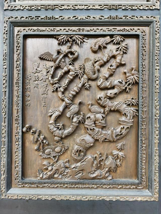 木雕是久负盛名的岭南传统手工艺,也是陈家祠中数量最多、规模最大的一种建筑装饰。从大门走入首进正厅,迎面便是四扇壮观的木雕屏门,从上到下布满了工艺精湛的木雕作品。屏门背面的两幅裙板上,遒劲的老竹盘旋而上,构成左右颠倒的两个“福”字,既寓意“福到盈门”,也寓意“节节高”。同时,“福”字的左半边拟写成草书的“多”字,右边看起来又形似一个“寿”字,代表着“多福多寿”。此外,老竹上还生长出多处竹笋和嫩芽,画面旁有一句题字“青春发达、大器晚成”。黄海妍告诉访学团,这些图案意在勉励族中学子无论是青春年少还是已苦读多年,都不要轻言放弃。一幅裙板里竟然隐藏了这么多寓意,用时下的流行语来说可谓是充满了情绪价值,令人不得不钦佩百多年前工匠们的技艺与巧思。类似这样的吉祥图案在陈家祠中比比皆是,洋溢着强烈的民间文化气息。