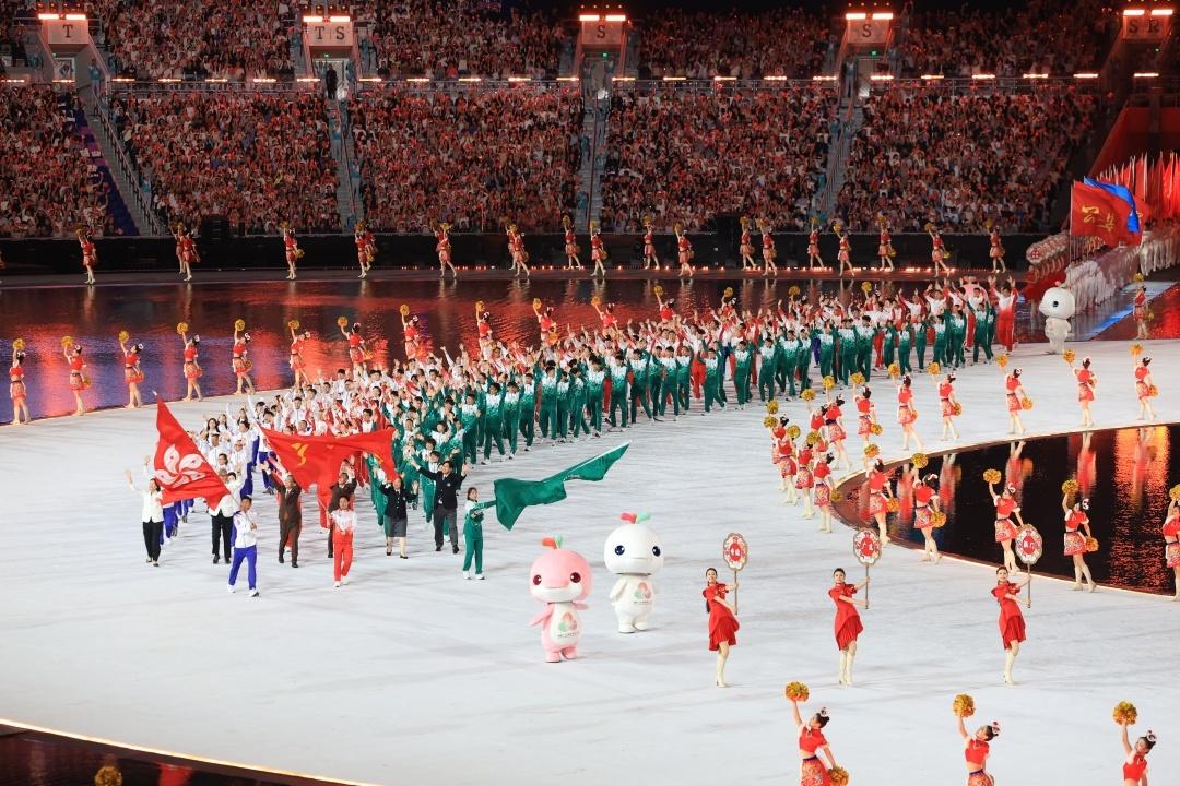 在开幕式上,与以往运动会用同一首《运动员进行曲》作为背景音乐不同,每个代表团都在高度具有该地区代表性的背景音乐声中走入会场。这对仪式标兵的欢迎动作和引导员的步速都有很高要求,他们要在音乐曲段里展示完该时长的动作。最后粤港澳三地代表团组成一个方阵出现时,现场奏响的音乐是《我和我的祖国》。