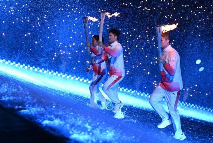 火炬手跑向主火炬台。 新华社记者 肖艺九 摄