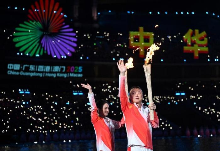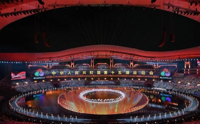 旗手护送中华人民共和国运动会会旗和第十五届全国运动会会旗入场。新华社记者 卢汉欣 摄