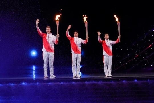 粤港澳三地运动员共同点燃主火炬“天海之冠”。