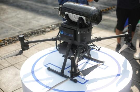 记者观察到,燃料电池上方安放有一个“能量胶囊”,储存着高度压缩的氢气,尽管内部的氢气只有几十克,却拥有很高的能量密度,从而保证氢能无人机有90分钟的超长续航。