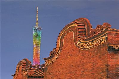 广州塔与广府祠堂在夜色里古今交融、相互辉映。广州日报全媒体记者 莫伟浓 摄