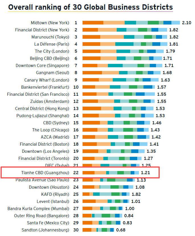 该报告由安永与城市土地学会组成的团队对全球19个国家的30个领先CBD,基于人才、市场接近度、影响力、外部条件、办公空间、消费活力、创新与可持续性等8个类别的基准评估体系,对榜单内30个CBD进行了系统性分析,形成了类别单项及综合排名,全面呈现了当今全球经济空间格局的深刻演变。