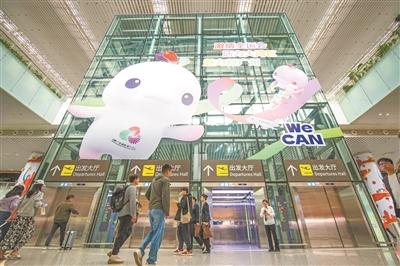 白云国际机场T2航站楼电梯塔楼的全运会吉祥物墙绘充满活力。(资料图片)广州日报全媒体记者 李波 摄