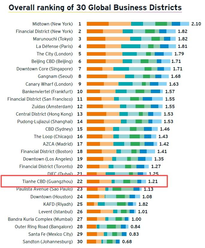 11月14日,《2025全球商务区吸引力报告》发布,天河中央商务区首次参评,即位列全球CBD第22位,为全国4强之一,也是广东省唯一入选的CBD。