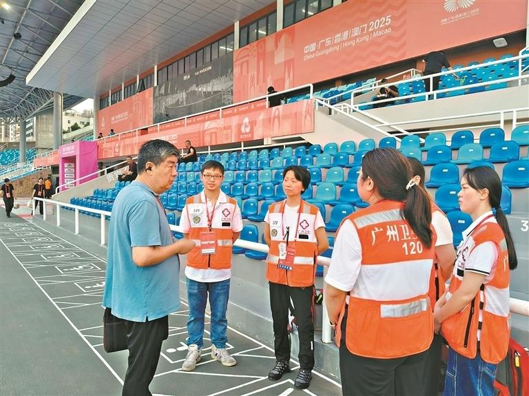 在足球场馆,他测算足球场最远两点距离间的步行时间,要求在场边两侧设置医疗点并停放救护车;在南沙体育馆,他优化医疗点布局,确保2分钟内覆盖所有区域;在天河体育中心,他检查核对各处的快速通道;在临时医疗观察室选址争议中,他凭借翔实的专业分析和严谨的沟通,反复协商沟通,将医疗站点、观察室科学、合理地设置在红线之内,确保伤病员能快速转运。以上各项关键决策不仅优化了救治响应链条,更在细微处体现了对“零失误”目标的坚守,为织密赛事医疗保障安全网奠定了坚实基础。