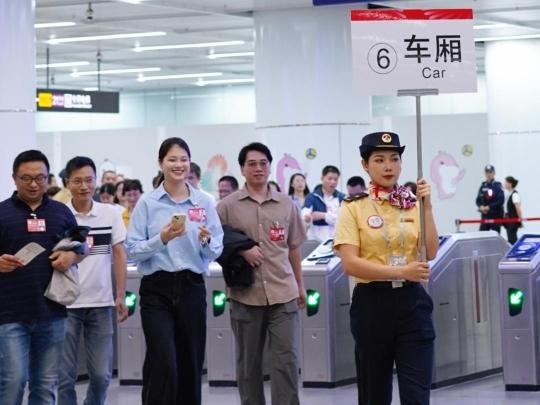 11月9日开幕式当天,为应对开幕式进、散场的集中客流,二十一号线天河公园至苏元段开行专列202列次,最小行车间隔从5分钟缩短至3分钟,运力提升67%,四号线首次分阶段调整终点站,散场时段最小行车间隔压缩至2分32秒,高效疏运观众和工作人员约6.46万人次,并通过公交接驳专线加强停运区段交通保障。此外,加强线网客流实时监测和行车动态调度,在嘉禾望岗站、水西站加开备用车补充运力,有效疏运迂回换乘客流和科教城师生返校客流等,累计加开列车6列次,确保线网客运组织平稳有序。