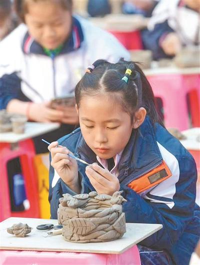 孩子们用灵巧的双手将民族文化的深厚底蕴凝练于一件件充满创意的陶艺作品之中。现场只见搓、捏、拍、刻,各色工具在指尖翻飞,陶泥逐渐显现出特别的纹样、绽放的花朵、欢舞的人物……作品题材广泛,生动展现了中华民族多元一体的文化盛景。