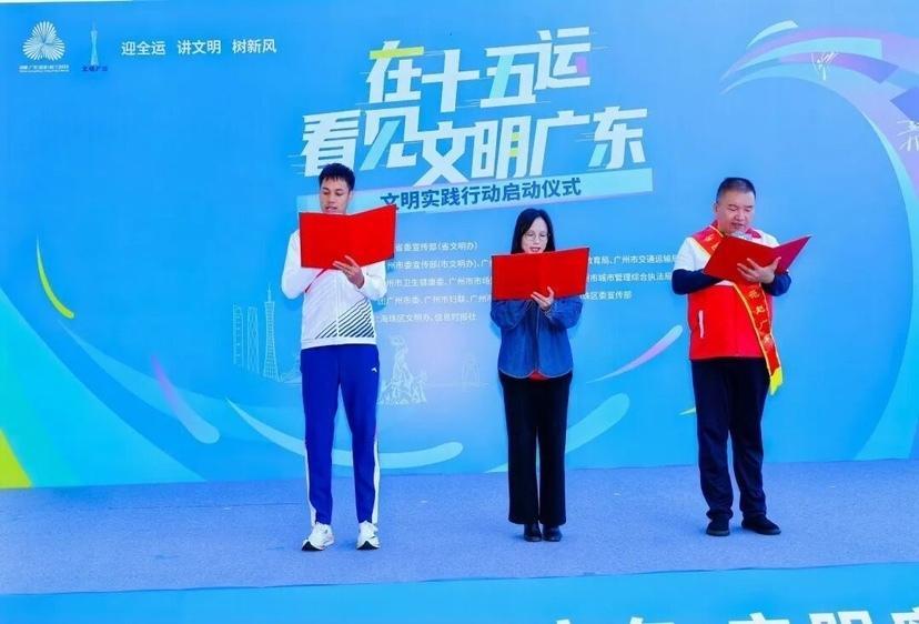 全运盛会,全民参与。今年11月5日,在广州举行的“在十五运,看见文明广东”文明实践行动启动仪式现场,赵广军协同广州好人沈燕芬等共同发起《迎接十五运会 共筑健康城》爱国卫生倡议,号召市民群众积极参与环境卫生整治,共同营造洁净优美的城市环境,为十五运会营造“人人参与、大家共享”的文明社会氛围。